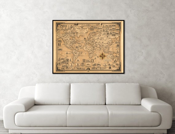 1939 World Wonders Map World Map Poster Print Vintage Pictorial